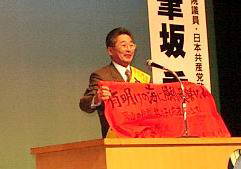 日本共産党の筆坂秀世政策委員長は、時々ユーモアを交えて、県政と国政をきびしく批判。また、金子知事に諌早湾干拓受注企業から2200万円の献金が渡されていること事実を明らかにしながら、「国言いなりの県政では、県民を幸せにはできない。「教え子を再び戦争に送るな」ということを原点に活動してきた高村さんこそ、知事にふさわしいと力説。 会場から大きな共感の拍手がおこりました。 |