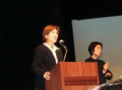 演説会の司会を務めたのは、長崎民医連の森さおりさんです。 また、あらゆる話は「手話通訳」されました。そのために3人の人たちが最後まで頑張ってくれました。(写真右) |