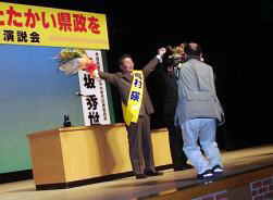高村暎さんは、教師になって一番最初に担任になった生徒たちが書いてくれた「寄せ書き」を最初に披露しました。 高村さんは「諌早湾干拓は県政転換の試金石」と強調。暮らしと教育を大事にする県政をみなさんとともにつくりたい」と、気迫を込めて演説。 参加者は、大きく長い拍手でこれにこたえました。 |