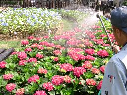 「あじさい」に水を与える職員のそばで、二人連れの女性観光客が「雨が降れば最高の風情ね」と空を見上げました |