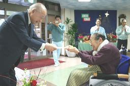 原水爆禁止長崎県協議会の柴田朴代表理事ら三人は二十八日、長崎市の恵の丘長崎原爆ホーム(堤房代施設長)を訪れ、被爆者への見舞金を手渡しました。