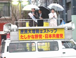 田村候補は、「福祉や医療が削られ、本当に国民の暮らしは大変。自民も民主も『福祉のために消費税増税』と言っているが、とんでもないこと。大企業に力に応じた負担を求めれば、消費税増税なしに福祉の予算は確保できる」と訴え。