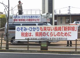 | 「新幹線が来れば、四カ町にはお客はおらんようになる」 「県民の会」の訴えに多くの賛同の声 東彼杵郡と佐世保市でキャラバン ![]() 8日、「新幹線」建設中止を求める県民の会(菅政和代表ら)は、県北地域でキャラバンを行い、宣伝、署名などにとり組みました。 キャラバン隊は、東彼杵町、川棚町、佐世保市の駅前やアーケード街など各所で、「長崎に来る新幹線は、のぞみやひかりではありません。わずかな時間短縮に、多額の税金が投入されるムダな事業です。特に、佐世保を経由しないなど県北地域にとっては、何の利益にもなりません」など訴え、建設中止署名への協力を呼びかけました。 東彼杵町では、宣伝カーの前を通る女性に署名を訴えたところ二つ返事で応じました。「新幹線は要りません」ときっぱり。 川棚町では訴えを聞いて、「近所に配るから」と会のビラを10枚、20枚ともらいに来る人が相次ぎました。 ![]() 佐世保市では、共産党の山下千秋市議も合流し、共に訴えました。 通りがかりの人たちが足を止め、「佐世保に来ない新幹線はいらん」、「新幹線が来れば、四カ町にはお客はおらんようになる」…など、次々に自らの思いを語りました。 「県民の会」の中里研哉事務局長は、「今日の行動に参加した人たちはみな口々に、『こんなに反響のある宣伝はあまり経験がない』と語っていたように、新幹線には多くの県民が疑問を持っていることを、改めて実感しました。ますます、会の活動を広げ、強めていきたい」と語っていました。 「県民の会」は13日に、長崎市の繁華街で大規模な宣伝活動を計画しています。 |