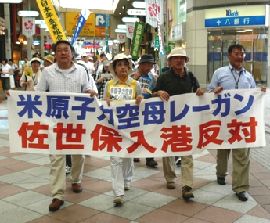 猛暑のなか、日本共産党や平和・民主団体から百四十人が参加。のぼりや「入港反対」の横断幕をひるがえし、「佐世保の『準母港化』を許すな」「米軍基地の再編・強化反対」とシュプレヒコールを繰り返しました。