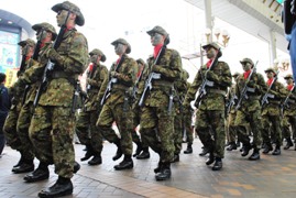 | 街中を武装行進 陸海自衛隊が強行 佐世保市 「戦争する国」許さない 平和団体など抗議 |