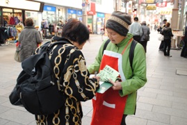 クリスマスの雰囲気に包まれた街で多くの買い物客が行き交う中、参加者12人はサンタの帽子などを身につけ、「戦争法廃止の署名です。日本を『戦争する国』にしないために署名を集めています」と呼びかけました。 男性(65)は「自民党が全部悪い。野党がバラバラでは数の力で抑えつけられてしまう。戦争だけはいかん」とのべ、署名。同じく署名した女性(70)は「戦争法は許せない。戦後がずっと続いてほしい」と話しました。 |