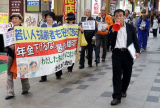 | 全日本年金者組合長崎県本部(宮地昭委員長)は18日、長崎市鉄橋で「年金者一揆2019」長崎集会を開きました。約70人が参加。「年金上げろ!消費税下げろ!」「老いも若きも手をつなぎ、年金・賃金引き上げよう」などと書かれたむしろ旗を何本も掲げ、そろいのオレンジ色のジャンバーで通行人にアピールしました。 労組や団体から連帯のあいさつがあり、県労連の馬場隆副議長は「若者も高齢者も安心して暮らせる年金制度を」と呼びかけました。日本共産党の内田隆英長崎市議があいさつしました。 県内各支部のメンバーが次々に発言し、「1日1食分を3回に分けて食べている」など、年金生活者の厳しい実態が語られました。 「年金下げるな」の横断幕を掲げアーケード街をデモ行進しました。 |