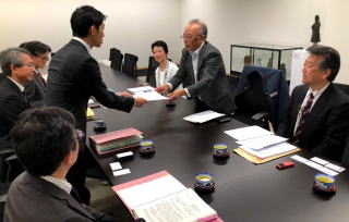 長崎県商工団体連合会は26日、新型コロナウイルス感染による経済的影響が深刻化する中、「中小業者・小規模事業者とフリーランスを守る緊急対策の要請」を中村法道知事に宛てて提出しました。徳永隆行会長と森和史事務局長が、政府の自粛要請などにより苦境に追い込まれている中小業者などへの支援を求めました。