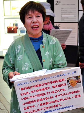 | 「長崎のうたごえ協議会」議長で被爆者の半生を歌い続ける 今年4月の核不拡散条約(NPT)再検討会議開催中の国連本部ロビーで、合唱組曲「平和の旅へ」を約40人の合唱団の仲間とともに演奏します。 「平和の旅へ」は、長崎で被爆したことで下半身不随となり、10年間寝たきりだった故渡辺千恵子さんが、母親や仲間に支えられ「車いすの被爆者」として世界で被爆体験を語るようになるまでを綴った創作曲。うたごえの仲間たちがその半生を聞き取り作詞・作曲しました。 1985年に初演。反響は大きく、その後「平和の旅へ」合唱団を結成し現在までに、約260回公演。「この曲は長崎のうたごえの原点」といいます。初演から歌い続け、「歌う語り部」として約15万人に届けてきました。 演奏を聞き「将来先生になって子どもたちに聞かせたい」との夢を抱いた女子中学生。教師となり滋賀県から教え子を連れ、再び演奏を聞きに来ました。「感動させられました。こんな風に平和のタネが全国に飛んでいけば、核兵器廃絶につながると実感した」と笑顔をみせます。 ニューヨークで初めて開催される原水爆禁止世界大会では「日本のうたごえ全国協議会」の一員としてオープニングを飾る予定。「被爆者のことを知る人が少ないアメリカで、被爆者の苦難の道のりをこの歌を通して伝えたい」―ニューヨークへ思いをはせます。 |
