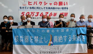 | 「『ヒバクシャ国際署名』をすすめる長崎県民の会」(県民の会)は9日、長崎市で会見し、「県民の会」が掲げていた同署名の目標50万人分を突破したと発表しました。 会見した長崎被災協の事務所には「ヒバクシャの願い50万3626筆 感謝」と書かれた横断幕が張り出され、テーブルには2万人分の署名用紙が積み上げられました。
