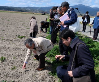 | 各分野の研究者、弁護士、市民などでつくる「日本環境会議」(理事長=寺西俊一・一橋大学名誉教授)のメンバー13人は16日、国営諫早湾干拓事業(長崎県諫早市)の潮受け堤防や干拓農地などを視察し、農漁民から聞き取りをしました。 同会の「諫早湾干拓問題検証委員会」の正式発足(4月)に向けての現地調査で、年内には地域の経済や有明海の再生に向けた提言をまとめる予定です。 中央干拓地では、松尾公春さん(63)の農地を視察。松尾さんは、調整池から飛来するカモに食いつくされたブロッコリーの畑を前に「県は『カモは自分で追い払え』と何もしてくれない。優良農地といわれて入植したがとんでもない」と憤りをあらわにしました。 視察後の総括会議では「市民も含め地域全体で、諫早湾の環境を良くしていくにはどうしたらいいのかという議論が必要」「掛け声は農業で始まったのに、農民のことが考えられていないことにショックを受けた」などの声があがりました。 寺西理事長は「有明海の自然や生業、文化がこのまま荒廃していくのはあまりにももったいない。そこを大きく切り替えていけるような夢のあるビジョンを出したい」と語りました。 |