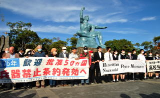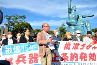 2017年7月に国連会議で採択された核兵器禁止条約の発効が確定したことを受け、「『ヒバクシャ国際署名』をすすめる長崎県民の会」は25日、長崎市の平和公園で「批准50カ国を祝い核兵器廃絶を誓うつどい」を開きました。 被爆者5団体の代表らをはじめ200人が参加しました。 「長崎県民の会」共同代表で長崎原爆被災者協議会の田中重光会長は「今の気持ちはこの晴れ渡った青空のようです」。目に涙をいっぱいため「私たち被爆者は、生きてきてよかったと心から喜びを分かち合う日を迎えました」と語り、数10万の原爆死没者と被爆者運動に死力を尽くした方々への感謝の気持ちを述べました。 長崎原水協の大矢正人代表理事は「日本国民の願いは一刻も早く戦争被爆国である日本政府が条約に調印することであり、核兵器のない世界に向けて本当の意味でのリーダーシップを取ることです」と訴えました。 「長崎県民の会」共同代表で長崎県被爆者手帳友の会の朝長万左男会長は「本当の核なき世界を目指す。明日からそのスタートです皆さん頑張りましょう」と力を込めました。 つどいに参加した大学1年の森爽さんは「先人たちによってつくられてきたこの歴史を、自分たちが受け継ぐ番が本当に来たんだと感じました」と話しました。 田上富久長崎市長もあいさつし、日本共産党の衆院長崎1区の安江あや子候補が参加しました。 |