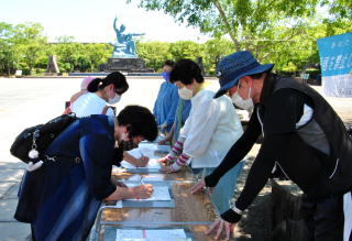| 長崎県原水協は9日、長崎市の平和公園で10人が参加して6・9行動を行い、「ヒバクシャ国際署名」への協力を呼びかけました。 大矢正人・県原水協代表理事は、平和公園から見通せる長崎被災協の窓に、ヒバクシャ国際署名の現在の到達「48万2073筆」と張り出された横断幕を指さし「50万人を目指し頑張っています。目標まであと1万7927筆です」と声をかけ署名を呼びかけました。女性(40)は「そうなんですね。核兵器だけでなく、すべての武器がなくなってほしい」と署名しました。 65歳の男性はサインした後、「核兵器の被害を教訓にして、すべての国が平和であるように長崎から発信したい」と語りました。 |