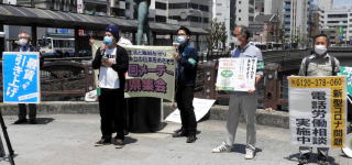 | 第91回長崎県メーデー集会は、新型コロナウイルス感染拡大を防ぐため中止となりました。その代わり実行委員会から10団体11人が参加し、長崎市の鉄橋(てつばし)でスタンディングアピールを実施しました。 参加者はメーデー集会の横断幕や「最賃引き上げ」「賃金上げて人を増やして」などのプラカードを持ち、ソーシャルディスタンスを守るため2bの間隔をあけてスタンディングしました。 飯田彰吾実行委員長が「コロナ感染拡大で、これまで削られてきた医療や役所の機能、労働者保護の政策がとても重要だということがよくわかった。失われた安心・安全や社会のしなやかさを取り戻していきましょう」とあいさつ。各団体から3人が発言しました。