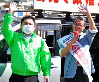 衆院九州・沖縄ブロックのまじま省三比例候補は、15日朝から長崎県佐世保市に入り、市内各地で街頭演説を行いました。小田徳顕佐世保市議も訴えました。 アーケード街近くの京町公園で訴えたまじま氏は、佐世保の米軍基地内の小・中学校について「1クラス20〜25人学級で、費用はすべて国民の税金で負担している。片や40人学級で学ぶ日本の子どもたちは、ソーシャルディスタンスを取ることもできない」と告発しました。 まじま氏は、米国言いなり、大企業・富裕層優遇の政治をやめ、支え合い助け合う政治にしていこうと呼びかけ「次の総選挙で市民と野党の共闘に政治を託してください。共闘の中心でがんばる共産党の国会議員を増やしてください」と訴えました。 小田市議は、県と佐世保市が強行している石木ダム建設事業について、「事業撤回までたたかっていく」と決意を語りました。 演説を聞いていた諌山隆子さん(72)は「国民が黙っていたら大変なことになる。佐世保市出身のまじまさんにがんばってほしい」と話しました。 この日、隣接する佐々町でのつどいにも参加しました。 |