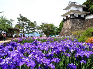 菖蒲園は大村湾を望む玖島(大村)城跡を利用してつくられた公園内にあり、夜はライトアップしたハナショウブを楽しめます。(6月20日まで)