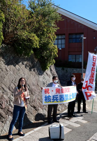 | 中米のホンジュラスが批准し、核兵器禁止条約の発効が確実になった25日午前、日本共産党の衆院長崎1区の安江あや子候補は、内田隆英・中西敦信の両長崎市議と共に「祝・発効 核兵器禁止条約」の横断幕を掲げ、浦上天主堂前で街頭宣伝をおこないました。