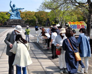 長崎県原水協は9日、長崎市の平和公園で「日本政府に核兵器禁止条約の署名・批准を求める署名」を呼びかける「6・9行動」に取り組みました。