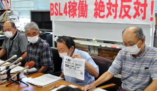 エボラ出血熱など危険度が最も高い病原体を扱う「バイオセーフティレベル(BSL)4」施設が、長崎大学医学部キャンパス(長崎市坂本)に完成することを受け、「BSL4施設計画の差し止めを求める会」(山田一俊代表)は29日、市役所で記者会見し「安全の保障のないBSL4を住宅密集地で稼働させることは許さない」と抗議の声をあげました。
