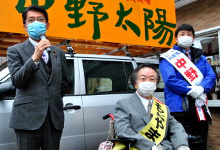 長崎県諫早市議選(定数26、立候補32人)が告示された21日、日本共産党の田村貴昭衆院議員が、中野太陽(43)、西田京子(72)=いずれも現=の2氏の出発式に駆け付け、必ず2議席確保をと呼びかけました。