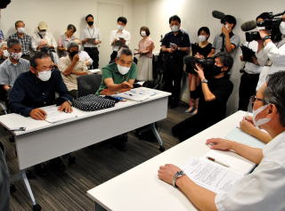県庁を訪れた「川棚町民の会」など3団体の約20人は、回答しなかったことに厳しく抗議。土木部河川課の担当職員は、「県として回答するとは言っていないし、今後も回答はしない」と言い放ちました。 「川棚町民の会」代表で水没予定地に暮らす炭谷猛氏(70)は「回答しないと言うのは県民無視ではないか。なぜ回答しないのか」とただしましたが、職員は「理由はありません」と切り捨てました。 参加者から「申し入れから1カ月も経っているのに、県は何ら手を打っていない。その間にどんどん広がっている」と抗議の声が上がりました。 |