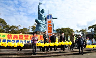 | 核兵器禁止条約が発効した22日、長崎市内では原爆が投下された午前11時2分に市内の教会やお寺の鐘が一斉に打ち鳴らされ、街中に響き渡りました。 「『ヒバクシャ国際署名』をすすめる長崎県民の会」は、禁止条約発効を歓迎するアピールを平和公園で行いました。 平和祈念像前に「歓迎 核兵器禁止条約」「核兵器の終わりが始まった」と書かれた横断幕が掲げられ、「長崎県民の会」共同代表で、県被爆者手帳友の会の朝長万左男会長と、長崎被災協の田中重光会長があいさつし、核廃絶に向けた決意を語りました。 「原爆投下76年目にしてやっと、覆われていた雲の間から暖かい日差しが差してきました」と被爆者の城臺(じょうだい)美彌子さんは条約発効の喜びを語り、日本政府に条約参加へ舵を切るよう強く迫りました。 同じく被爆者の田中安次郎さんは「志半ばで亡くなった先輩方に感謝し『やっとここまで来ましたよ』と報告したい」と述べ、「孫や子どもたちが二度と戦場へ行くようなことがないよう、これからも心を込めて活動していきたい」と語りました。 午前11時2分に全員で黙とう。世界に存在する約1万4000発の核兵器に見立てた140個の黄色い風船を、被爆者らが一つずつ空気を抜いてしぼませ、核兵器を廃絶するまでがんばる決意を固めあいました。 |