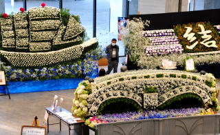 | 長崎県庁ロビーに、県産の菊などを使い、長崎の名所・眼鏡橋や帆船をかたどったフラワーアレンジメント作品が展示されています。(9日まで) 新型コロナウイルスの感染拡大により、葬儀、結婚式の規模の縮小や飲食店の経営悪化などで花の注文が激減。花卉(かき)業界は深刻な打撃を受けています。今回、県花き振興協議会が、少しでも花の需要を喚起しようと企画しました。 長崎花商協同組合加盟の5店が参加。今回は葬儀に多用される「白菊」をメインに使い、祭壇をつくる技術で迫力ある作品をつくりました。好評で、第2弾の計画もあるといい、花店の社長は「花屋の技術を見てほしい」と語りました。 |