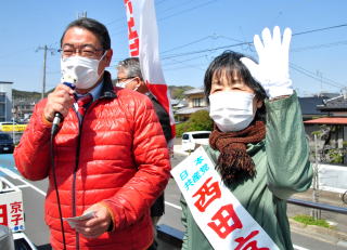 中野候補は「給食費の無償化や不育症治療への助成、大学生への給付型の奨学金制度など、子育て応援の諫早市に」と訴え、西田候補は「島原三市のように『高齢者にタクシー券を』と一般質問で8回、要求してきました。1日も早く実現するためにがんばりたい」と力を込めました。 終了後、男性がかけ寄り、「自民党はあまりにもひどい。共産党に頑張ってもらわないと」と激励しました。 |