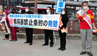| 核兵器禁止条約発効が翌日に迫った21日、日本共産党のまじま省三衆院九州・沖縄ブロック比例候補は長崎市に入り、条約発効を祝う街頭演説をしました。安江あや子衆院長崎1区候補と内田隆英、中西敦信両市議も参加しました。