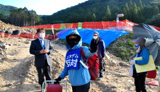 | 長崎県と佐世保市が川棚町に計画する石木ダム建設事業に伴う県道の付け替え道路工事現場で、県が盛り土工事を強行し、建設に反対する地元住民らの座り込みの範囲がどんどん狭められています。日本共産党の仁比聡平前参院議員は18日の夕刻、現地に駆け付け、地元住民らを激励しました。