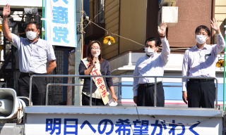 安江候補は「人の話を聞くのが得意だと言った岸田首相は、国会で野党と論戦することなく解散してしまった。まったく話を聞く気がない姿勢が明らかになった」と厳しく批判しました。 高校を卒業後、ずっと非正規雇用で、将来に希望を持てず不安ばかりの苦しい暮らしだった自らの体験を語り、「8時間働けば普通に暮らせる。雇用は正社員が当たり前の社会をどうしても実現したいのです。そのためにはこの総選挙、市民と野党の共闘で野党連立政権を実現しよう。その要として力を尽くす共産党を大きく伸ばしてください」と訴えました。 |