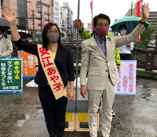安江候補は「国会では、小学校の35人学級が実現し、人権を無視した入管法改定案が廃案に追い込まれるなど、声を上げ、行動すれば政治は変えられることを私たちは体験しました。コロナ対策に全力を挙げ、命とくらしを守る政治をつくるためにご一緒に声を上げていきましょう」と訴えました。 被爆者の田中安次郎さん(78)がマイクを握り「世の中の片隅で細々と暮らしている人々に寄り添う共産党の躍進を」とエールを送りました。 |