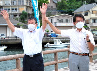 日本共産党の田村貴昭衆院議員は11日、長崎県壱岐市で街頭演説を行い、25日告示(8月1日投票)の同市議選での山口よしひで候補の初議席獲得と衆院選での日本共産党の躍進を訴えました。 田村氏は、山口候補について、「防災無線が聞こえないと聞けば役所にかけ合い改善させ、市民がどういう要求を抱えているのか、アンケート調査をまとめたものを市に提出するなど、一生懸命市民の願い実現へと頑張ってきた」と支持を呼びかけました。 田村氏は、オリンピック開催にふれ「政府の行為によって感染を広げることは許されない。命を守り、生業を守っていくためにも、日本共産党と山口候補にその思いを託してください」と力を込めました。 山口候補は「市政のムダ使いを正し、高齢者タクシー券の支給や、子ども医療費の窓口払いなし実現へ、その先頭に立って頑張ります」と決意を語りました。 2人の演説に家から出てきて聞き入る人の姿がありました。プロテスタント教会の牧師の女性(80)は「オリンピックより国民の命を守れという声が広がり、共産党が日本の運動をリードしていると思う」と語りました。 |