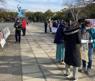 21人が参加。「日本政府は核兵器禁止条約にいますぐ参加を」の横断幕が掲げ、「長崎のうたごえ協議会」のメンバーが歌声を響かせ、署名への協力を訴えました。 愛知県から家族と平和公園を訪れた20代の女性は駆け寄って署名し、「高校生の時、広島で署名活動をしていました。頑張ってください」と話しました。 会場を訪れていた高校生1万人署名に参加している高校生たちが次々署名しました。 県原水協の大矢正人代表理事は、「NPT再検討会議が延期になったが、3月には核兵器禁止条約締約国会議が開催されます。引き続き、日本政府に条約の批准を求める活動を頑張りたい」と語りました。 |