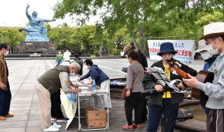 「ロシアはウクライナ侵略を即時に中止せよ」「日本政府は核兵器禁止条約に参加せよ」と書かれた横断幕を掲げる中、神奈川県から来た女性(63)は「戦争が早く収束してほしい。ロシアによる核兵器使用の脅し、そういうのがない世の中になってほしい」と署名。東京から娘と訪れた女性(46)は、ロシアの核威嚇について「唯一の戦争被爆国の国民として、長崎、広島のことを思えば二度と核戦争になってはいけない」と語りました。 東京から修学旅行で来た中学3年の男子生徒5人も署名をしました。昨日、被爆者の体験を聞いたといい、「原爆で被害を受けた上に差別にもあったと言っていた。今では考えられない。核兵器はなくさないと」と話しました。 「長崎のうたごえ協議会」が「青い空は」「戦争を知らない子どもたち」「折り鶴」などを演奏。署名への協力を呼びかけました。 |