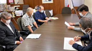 「このような市長の投稿は容認できない」と平戸支部の寺田重也支部長、岡村文雄副支部長は、原口敏彦県書記長とともに市役所を訪れました。