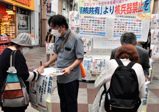 13人が参加。「『核共有』より核兵器禁止を」と書かれたカラフルな横断幕と、禁止条約に署名した91カ国と、批准した68カ国の名前と国旗が並んだポスターを掲げ、買い物客などが行き交うアーケード街で署名への協力を呼びかけました。 メンバーが「核戦争に勝者はありません。核廃絶に向けて被爆地長崎から声を上げていきましょう」と訴えると、学校帰りの高校生らが次々と呼びかけに応えました。 署名をした高校2年の男子生徒は「核兵器は廃絶してほしいし、ソ連によるウクライナ侵略のような戦争もなくなればいい」と語りました。 「署名がどういう役割を果たすのかわからない」と躊躇(ちゅうちょ)していた女子高校生3人は、原水協メンバーが丁寧に疑問に答え「この署名を、核兵器について考える機会にしてほしい」と話すと納得して署名しました。 |