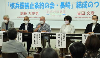 ロシアのプーチン大統領によるウクライナ侵略が続くなか、日本をはじめ世界各国の政府に核兵器禁止条約への参加を求める「核兵器禁止条約の会・長崎」が28日、長崎市内で結成されました。結成集会には70人が参加。同会の共同代表に被爆者4団体の代表と被爆二世の柿田富美枝さんの5人が就任しました。