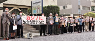 県は答弁書を提出し、公金支出は適法だとして請求の棄却を求め争う姿勢を示しました。 提訴したのは「ストップ・カジノ!長崎県民ネットワーク」の有志8人。訴状などによると、県が区域整備計画の認定を国に申請した際に添付した「コミットメントレター(金融機関による融資に関する意向表明書)」の中身が県議会などでも一切公表されず、客観的な確認や審査が行われていないため、「資金調達の確実性を裏付ける客観的な資料」に該当しない可能性があると指摘。その場合、同計画が国により認定される余地はなく、委託料を支出する必要性は認められないとしています。 原告の今井一成弁護士の弁論の後、報告集会が開かれ、原告や支援者が発言しました。 原告の山下優子さん(新婦人)は「ハウステンボスの前の道路は狭くて開発にもお金がかかる。これを許せばカジノに湯水のように税金がつぎ込まれていく。この入り口の1億で止めたい」と語り、子育て中の女性は「貴重な税金をカジノに使うのではなく福祉のために使ってほしい」と訴えました。 |