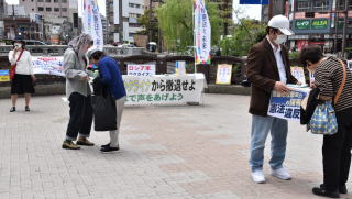憲法改悪阻止長崎県共同センターは13日、長崎市の繁華街で憲法改悪に反対する署名・宣伝行動をしました。あわせて「ロシアはウクライナから撤退せよ」の横断幕を掲げ、ウクライナ支援の募金を呼びかけました。