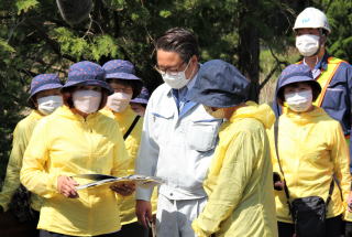 岩下すみ子さん(73)が、予定地に暮らす13世帯の家族構成などを説明しながら案内。大石知事は「自然が豊かで、その中でみなさんのお話を聞けて良かった」と語り、岩下和雄さん(75)は「工事を中断し話し合いの場を持ってほしい」と要望しました。