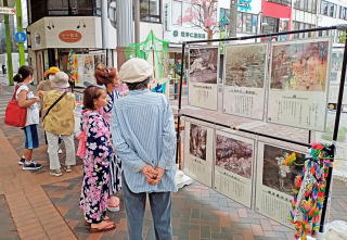 「日本政府は核兵器禁止条約に参加を」の横断幕を掲げ、「日本政府は核兵器禁止条約に参加すべきかどうか」を問うシール投票も実施。「参加すべき」が101人、「参加しないでよい」が5人という結果でした。 中学生のグループに話しかけると、中学生は「ウクライナの戦争は大変なこと。僕たちがしっかりせんば」と言って「禁止条約に参加すべき」にシールを貼りました。 小学2年と4年の子どもを連れたお父さんは「小4の子がもうすぐ長崎の原爆資料館に行くのでその前に見せたいと思い連れてきた」と話し、年配の男性は、父親が終戦前に召集され戦死、母親も亡くなり孤児として苦労した体験を述べ、「また来年も見に来ます」と語りました。 昨年後援した佐世保市は今年、「政府に禁止条約参加を求める横断幕を掲げるのなら市の方針と違う」として後援を取り下げ、市教育委員会のみの後援となりました。 |