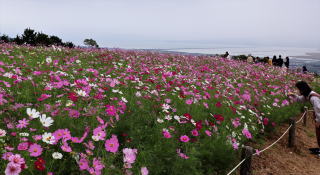 長崎県諫早市の白木峰高原で、20万本のコスモスが見ごろを迎えています。多くの市民が訪れ、咲き誇る花々を楽しんでいました。遠くには諌早湾と締め切り堤防が見えます。
