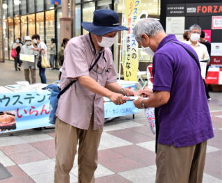 長崎県と佐世保市が同市のハウステンボスに誘致を狙うカジノを含む統合型リゾート施設(IR)に反対する「ストップ・カジノ!長崎県民ネットワーク」は6日、長崎市中心部のアーケード街で国への整備計画の認定申請撤回を求める署名への協力を呼びかけました。 10人が参加。「ハウステンボスにいらんばいカジノ」と書かれた横断幕を掲げ、ビラを配布し署名への協力を呼びかけました。 高校生の娘とともに署名した50代の女性は「ハウテンボスにはよく行くので、カジノが来るなんていい感じはしない。依存症の人もいるのに、あえてハウステンボスに造る必要はない」と語りました。 7歳と3歳の子どもを連れた女性(32)は「カジノではなく福祉や高齢者医療に目を向けるのが先ではないか。がんばってください」と激励し署名しました。「市民の声が届かない。国葬もそうだが、声が届く政治になってほしい」と憤る女性(67)もいました。 IR誘致を巡っては、県が開業資金4383憶円について「コミットメントレター(金融機関による融資に関する意向表明書)」の企業名などを明らかにしないまま、国に整備計画を申請し批判の声があがっていました。報道によると大石賢吾知事は6日、2社の企業名を公表しましたが、調達額などは公表できないとしており、依然不透明です。 |