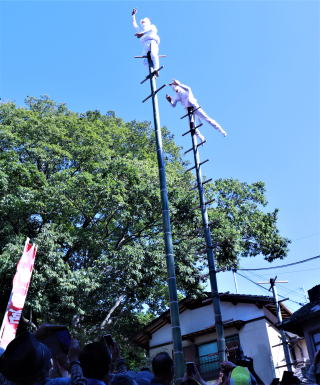 コロナの感染拡大で休止していた、長崎市伊良林の若宮稲荷神社の秋の大祭「竹ン芸」が3年ぶりに奉納されました。国と市の無形民俗文化財で10月14、15の両日催されます。 高さ10b余りもある青竹の上で、祭りばやしに浮かれて、狐が戯れる様子を表現。足場がついているのが「昇り竹」、もう一本は「振り竹」と呼ばれ、白狐の面と白装束に尾をつけた女狐(めぎつね)と男狐(おぎつね)に扮した若者が曲芸を披露します。 「振り竹」のてっぺんで、ゆら〜り、ゆら〜りと揺れながら、女狐が縁起餅をまくと、見物する人たちから歓声が上がりました。 |