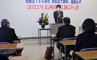 長崎県の日本共産党県委員会と南部地区委員会は10日、田村貴昭衆院議員を迎え、長崎市内で党旗びらきを行いました。 山下満昭県委員長があいさつに立ち、「中間地方選と参院選、そして知事選とすべての選挙に打ち勝って党創立100周年を迎えよう」と呼びかけました。 田村氏は、衆院選で長崎から野党共闘の議員(立憲民主党)2人が誕生し、石木ダム建設反対などで共同して頑張っていると報告。「次につながる結果になった。野党共闘にいささかの間違いもない」と強調しました。 「黒い雨」訴訟判決にもふれ、岸田首相が長崎の「被爆体験者」を除外したことについて「岸田首相は丁寧に国民の声を聞くと言いながら門前払い。実際は聞き流しているだけ」だと厳しく批判しました。 昨年秋に入党した新成人の女性が党本部での旗開きを視聴した感想を述べ、「こんなに素晴らしい政党は他にはありません」と党への思いを語りました。 2月の知事選で、「民主長崎県政をつくる会」と共産党県委員会が自主的支援を決めた宮沢由彦知事候補も駆け付け、支援を訴えました。 長崎県の立憲民主党の山田勝彦、末次精一両衆院議員から連帯のメッセージが寄せられました。 |