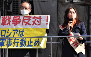 日本共産党長崎県委員会は25日、山下満昭委員長と参院長崎選挙区の安江あや子候補が、長崎市の長崎駅前などで「ロシアは軍事作戦を直ちに中止せよ」と訴えました。