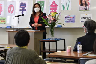 長崎市の日本共産党女性団体後援会は24日、長崎市内で安江あや子参院選挙区候補を迎え、参院選勝利に向けた春の学習会を開きました。 約30人が参加。女性団体のうたごえサークル有志による合唱でスタート。松本セツ子同会会長は、滋賀県近江八幡市議補選で共産党候補が比例の約4倍の得票でトップ当選したことを紹介し、「こんな選挙を長崎でもやろう。参院選での必勝目指し真剣に取り組んでいきたい。知を力にがんばっていこう」とあいさつしました。 安江氏は、ロシアのウクライナ侵攻を受けての「核共有」や改憲の動きを厳しく批判。「この機に乗じた軍拡と9条改憲は絶対に許されない」と力を込めました。さらにコロナ禍での女性の厳しい生活実態にふれ、男女賃金格差の是正が必要であり、そのためには党の躍進が重要だと強調。「参院選ではにひそうへい候補を始め、比例5人の当選と選挙区での勝利に向け先頭に立ってがんばる」と決意を語りました。 牧山隆南部地区委員長が「はてなリーフ」を紹介しながら、自衛隊問題などを語りました。 |