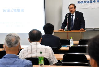 1902年に「東洋日の出新聞」を長崎で創刊した鈴木天眼についての著書がある高橋氏は「国民あっての国家である」との思想のもと、軍国主義に反対し続けた天眼の生きざまを現在の日本の状況に引き寄せ語りました。 被爆者問題について話をすすめた高橋氏は、米国が原爆投下後、放射線被害を隠ぺいし、原爆報道を完全に禁止したことにふれ、「米ソ冷戦で緊迫する中、核戦争の危機が迫っているように米国では思われていた。残留放射線の被害がないようにし、核戦争に米国民を動員する狙いがあった」と指摘しました。 被爆者を放置、援護を放棄し、米国に一度として抗議しなかった日本政府を「救える命を救わなかった犯罪的行為」と批判。原爆被害の隠ぺいを図った米国に付き従った実態を告発しました。 残留放射能を認めず、被爆者の存在自体を抹殺しようとする政府に対し、被爆者たちが起こした裁判の意義と運動の成果について詳しく示し、「たたかいは続く。78年間の運動の成果をみんなで共有し、頑張っていきたい」と力を込めました。 |